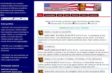 Em mais uma iniciativa promovida por Paulo Querido, na qual tenho a satisfação de colaborar, encontra-se já disponível online uma página agregadora interactiva referente à cobertura das eleições presidenciais americanas de 2008, na qual todos podem participar, seja com os seus blogues, via Twitter ou através do delicious.