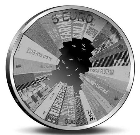 Fantástica! Esta moeda comemorativa holandesa, alusiva ao tema “A Holanda e a Arquitectura”, da autoria de Stani Michiels (que aqui detalha o seu processo de concepção e desenho), apresentando numa das faces uma combinação da lombada de livros de arquitectura, moldando no seu interior a silhueta do mapa do país, e, na outra face, o nome de mais de 100 famosos arquitectos holandeses, formando a imagem da rainha holandesa (Beatriz).