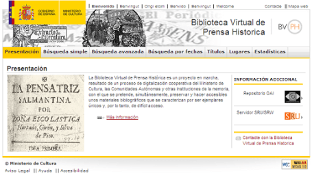 Numa iniciativa do Ministério da Cultura espanhol – decorrendo de convénios celebrados com várias Comunidades Autónomas e outras instituições, como a Hemeroteca Municipal de Madrid -, foi hoje apresentada a “Biblioteca Virtual de Prensa Histórica“, facultando o acesso livre a cerca de 2 000 jornais publicados em Espanha desde o século XVIII (datando o exemplar mais antigo de 1777), num total de cerca de 4,3 milhões de páginas digitalizadas, incluindo igualmente publicações de imprensa clandestina, nomeadamente cerca de 90 000 páginas do Partido Comunista de Espanha.