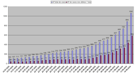 Há precisamente um mês o número total de casos de Gripe A em Portugal ultrapassava a centena; hoje excedeu o milhar. Não obstante o número de doentes internados seja diminuto (apenas 10, representando menos de 1 % do total de infectados) e a maior parte dos casos terem sido já debelados, não deixa de ser sintomática a progressão do crescimento do número de casos anunciados nos últimos 7 dias, que é já superior ao número global de casos registados até há uma semana atrás.