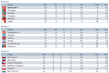 Jg V E D G Pt 1º Dinamarca 10 6 3 1 16 - 5 21 2º Portugal 10 5 4 1 17 - 5 19 3º Suécia 10 5 3 2 13 - 5 18 4º Hungria 10 5 1 4 10 - 8 16 5º Albânia 10 1 4 5 6 - 13 7 6º Malta 10 - 1 9 0 - 26 1