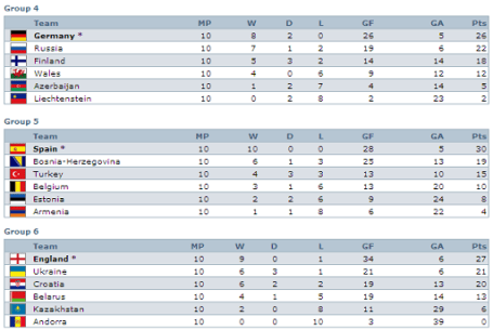 Estão já apuradas para a Fase Final do “Mundial 2010” as selecções vencedoras de cada um dos nove Grupos de qualificação: Dinamarca, Suíça, Eslováquia, Alemanha, Espanha (com o Campeão da Europa a fazer o pleno, com dez vitórias em dez jogos!), Inglaterra, Sérvia, Itália e Holanda.