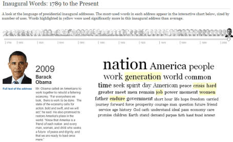No dia do primeiro aniversário da tomada de posse de Barack Obama – na mesma data em que assumiram também o cargo: Franklin D. Roosevelt (1937, 1941 e 1945), Harry S. Truman (1949), Dwight D. Eisenhower (1953), John F. Kennedy (1961), Lyndon B. Johnson (1965), Richard Nixon (1969 e 1973), Jimmy Carter (1977), Ronald Reagan (1981), George H. W. Bush (1989), Bill Clinton (1993 e 1997) e George W. Bush (2001 e 2005) -, oportunidade para recordar os discursos de investidura dos 44 Presidentes dos Estados Unidos da América, numa excelente infografia do New York Times, que disponibiliza inclusivamente cópia do correspondente jornal de cada época (desde 1853).