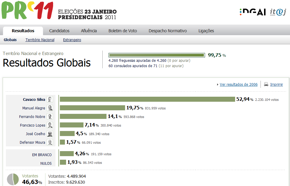 - Tal como em 2006, não é indicado procurar minimizar a legitimidade política da vitória de Cavaco Silva; a margem obtida face aos restantes candidatos “fala por si”, sendo cabalmente esclarecedora. Tal como não foi certamente a via mais indicada a adoptada pelo Presidente recandidato e reeleito no teor do seu discurso de vitória, repreendendo os abstencionistas e acusando os adversários de terem baseado a campanha em ataques pessoais. Em contraponto ao digno discurso de derrotado de Manuel Alegre e ao lúcido discurso de Pedro Passos Coelho, desligando o resultado da eleição presidencial de outras ilações de índole partidária.