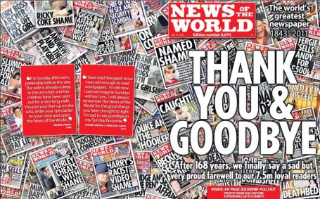O jornal tablóide britânico News of the World é hoje encerrado, por decisão do seu proprietário, Rupert Murdoch, na sequência do seu envolvimento em métodos ilegítimos e ilegais de obtenção de informação, nomeadamente por via de escutas abusivas, que acabaram por se repercutir em significativa quebra de publicidade.