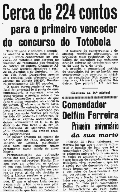 No concurso inaugural, o vencedor foi premiado com 224 contos (equivalente a pouco mais de 1 100 euros na moeda actual).