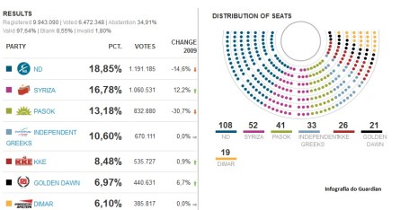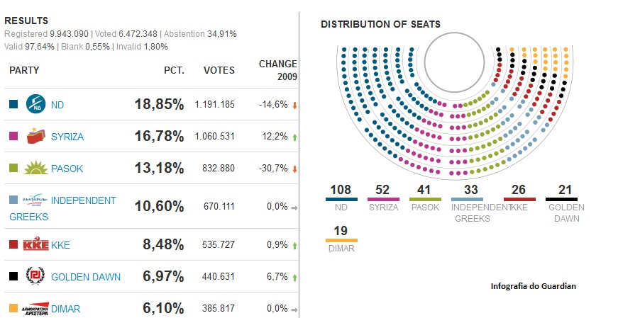Os partidos que, tradicionalmente, vinham alternando na liderança do Governo (Nova Democracia e PASOK) – que integravam o Governo de coligação, o qual constituía o principal suporte ao plano de resgate com a Troika internacional do FMI / Comissão Europeia / BCE – perderam, respectivamente 14,6 % e 30,7 % (!), passando de um domínio hegemónico (no seu conjunto), de 77 %, para apenas 32 % dos votos – ficando aquém do número mínimo de deputados par obter a maioria no Parlamento (somam apenas 149, sendo a maioria alcançada com 151 – não obstante o partido vencedor ser premiado, pelo sistema eleitoral grego, com um bónus de 50 mandatos).