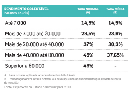 (Às taxas indicadas acresce a sobretaxa de 4%, em todos os escalões; no escalão mais alto – agora a partir de um rendimento de 80 000 €, acresce ainda a taxa de solidariedade, de 2,5%, elevando a taxa global até uns absurdos 54,5%!)