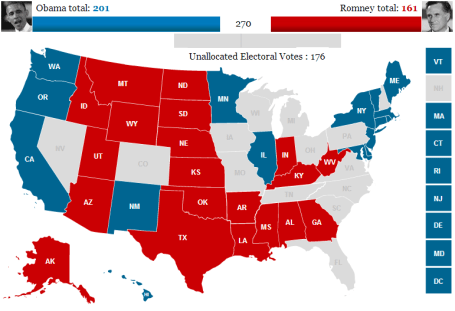 Sendo a vitória nestas eleições alcançada com a obtenção de 270 “Grandes Eleitores”, tudo se deverá decidir nos restantes 14 Estados (os quais correspondem a um total de 176 “Grandes Eleitores”), apresentando as seguintes tendências: