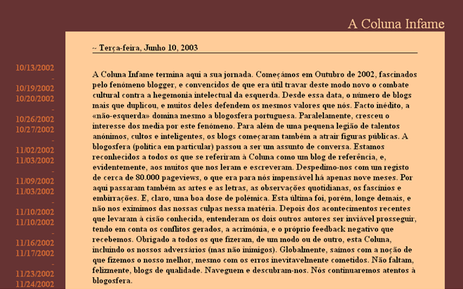 Faz hoje 10 anos, nascia a blogosfera em Portugal, com o surgimento d’A Coluna Infame, sobre cujo fim (ocorrido a 10 de Junho de 2003) escrevia, três dias depois, em editorial no “Público”, o seu então Director José Manuel Fernandes: