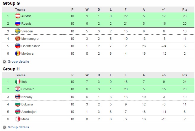 Por seu lado garantiram a presença no “play-off” as seguintes selecções: Bósnia-Herzegovina, Ucrânia, Irlanda, Eslovénia, Hungria, Suécia, Noruega e Dinamarca.