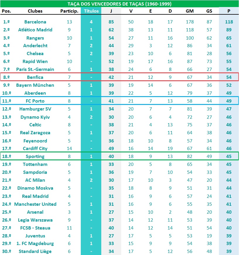 A Taça dos Vencedores de Taças disputou-se entre 1960-61 e 1998-99, num total de 39 edições, ocupando os três principais clubes portugueses posições dignas de especial registo no ranking histórico global desta competição, liderado pelo Barcelona, com Benfica, FC Porto e Sporting, respectivamente, no 8.º, 11.º e 18.º lugares!