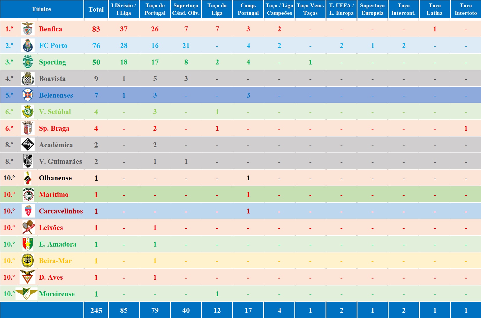 Vencedor Finalista Épocas (Vencedor / Finalista) Benfica 26 10 1939-40; 1942-43; 1943-44; 1948-49; 1950-51; 1951-52; 1952-53; 1954-55; 1956-57; 1958-59; 1961-62; 1963-64; 1968-69; 1969-70; 1971-72; 1979-80; 1980-81; 1982-83; 1984-85; 1985-86; 1986-87; 1992-93; 1995-96; 2003-04; 2013-14; 2016-17 1938-39; 1957-58; 1964-65; 1970-71; 1973-74; 1974-75; 1988-89; 1996-97; 2004-05; 2012-13 Sporting 17 12 1940-41; 1944-45; 1945-46; 1947-48; 1953-54; 1962-63; 1970-71; 1972-73; 1973-74; 1977-78; 1981-82; 1994-95; 2001-02; 2006-07; 2007-08; 2014-15; 2018-19 1951-52; 1954-55; 1959-60; 1969-70; 1971-72; 1978-79; 1986-87; 1993-94; 1995-96; 1999-00; 2011-12; 2017-18 FC Porto 16 14 1955-56; 1957-58; 1967-68; 1976-77; 1983-84; 1987-88; 1990-91; 1993-94; 1997-98; 1999-00; 2000-01; 2002-03; 2005-06; 2008-09; 2009-10; 2010-11 1952-53; 1958-59; 1960-61; 1963-64; 1977-78; 1979-80; 1980-81; 1982-83; 1984-85; 1991-92; 2003-04; 2007-08; 2015-16; 2018-19 Boavista 5 1 1974-75; 1975-76; 1978-79; 1991-92; 1996-97/ 1992-93 V. Setúbal 3 7 1964-65; 1966-67; 2004-05 1942-43; 1953-54; 1961-62; 1965-66 1967-68; 1972-73; 2005-06 Belenenses 3 5 1941-42; 1959-60; 1988-89/ 1939-40 1940-41; 1947-48; 1985-86; 2006-07 Sp. Braga 2 4 1965-66; 2015-16 1976-77; 1981-82; 1997-98; 2014-15 Académica 2 3 1938-39; 2011-12 1950-51; 1966-67; 1968-69 V. Guimarães 1 6 2012-13/ 1941-42; 1962-63; 1975-76; 1987-88; 2010-11; 2016-17 Leixões 1 1 1960-61/ 2001-02 Beira-Mar 1 1 1998-99/ 1990-91 E. Amadora 1 - 1989-90 D. Aves 1 - 2017-18 Atlético - 2 1945-46; 1948-49 Marítimo - 2 1994-95; 2000-01 Rio Ave - 2 1983-84; 2013-14 Estoril - 1 1943-44 Olhanense - 1 1944-45 Torreense - 1 1955-56 Covilhã - 1 1956-57 Farense - 1 1989-90 Campomaiorense - 1 1998-99 U. Leiria - 1 2002-03 Paços Ferreira - 1 2008-09 Chaves - 1 2009-10