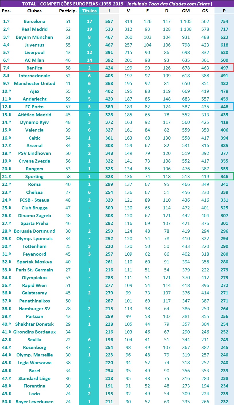 Um escalonamento dos 50 principais clubes da história das provas da UEFA, no qual três clubes portugueses marcam posição destacada: o Benfica, num excepcional 6.º lugar – aliás, pontualmente igualado com o 5.º classificado, o novo Campeão Europeu, Liverpool -, à beira dos 500 pontos (apenas superado pelos “colossos” Real Madrid, Barcelona, Bayern e Juventus); o FC Porto, numa excelente 12.ª posição; o Sporting, num notável 22.º posto (todos com mais de 300 jogos disputados)!