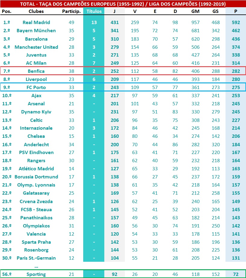 Neste “ranking” histórico global da principal competição europeia de clubes, Benfica e FC Porto – contando, cada um deles, com 2 títulos de Campeão Europeu nos respectivos palmarés – ocupam notáveis 7.º e 9.º postos (curiosamente, enquadrando o novo Campeão Europeu, Liverpool, qual “guarda de honra”), tendo superado ambos já as 100 vitórias, feito apenas alcançado por 10 clubes europeus. É de sublinhar que apenas Espanha, Inglaterra e Itália estão a par de Portugal, cada país com dois clubes no “Top 10” histórico.