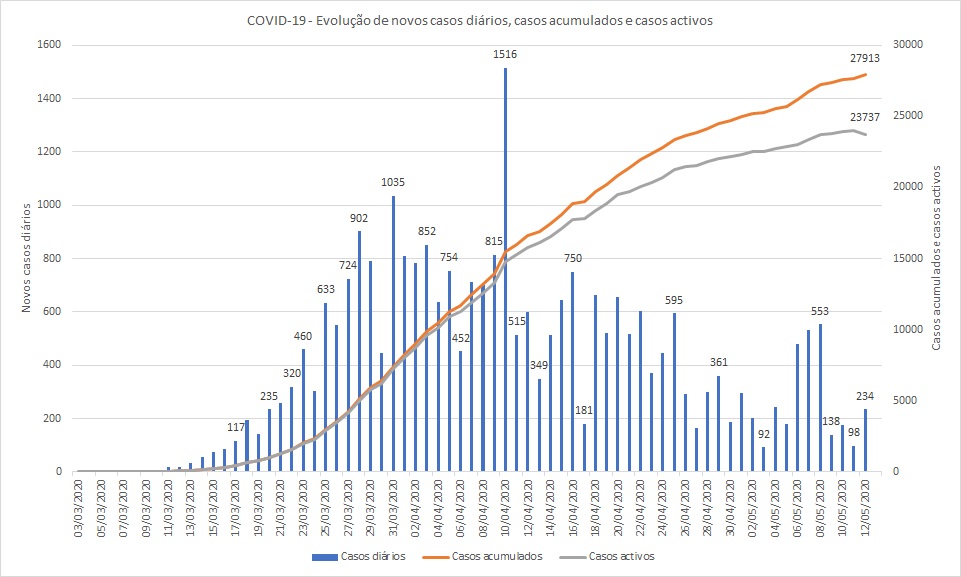 De acordo com os dados oficiais da Direcção Geral de Saúde, hoje, pela primeira vez desde o início da pandemia em Portugal, o número de casos activos decresceu: