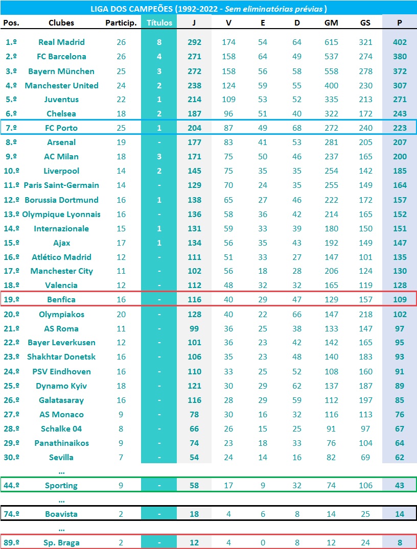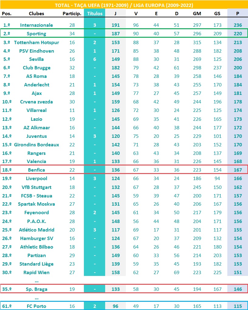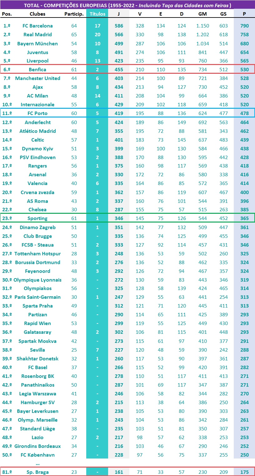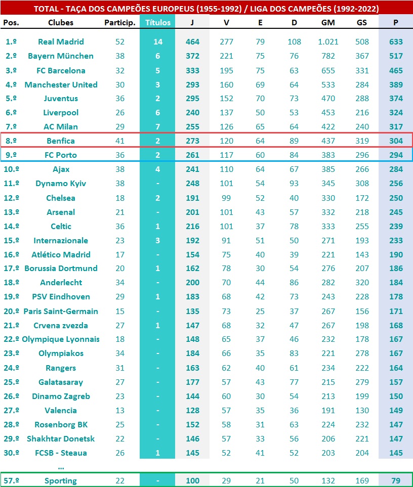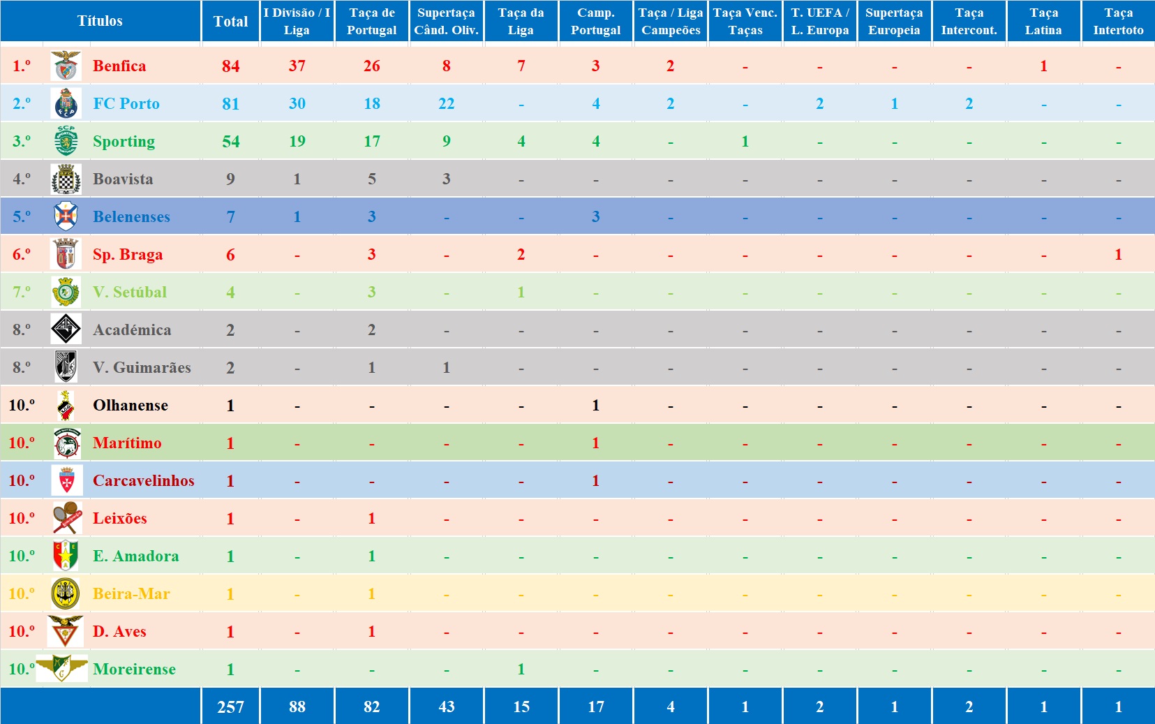 Vencedor Finalista Épocas (Vencedor / Finalista) Benfica 26 12 1939-40; 1942-43; 1943-44; 1948-49; 1950-51; 1951-52; 1952-53; 1954-55; 1956-57; 1958-59; 1961-62; 1963-64; 1968-69; 1969-70; 1971-72; 1979-80; 1980-81; 1982-83; 1984-85; 1985-86; 1986-87; 1992-93; 1995-96; 2003-04; 2013-14; 2016-17 1938-39; 1957-58; 1964-65; 1970-71; 1973-74; 1974-75; 1988-89; 1996-97; 2004-05; 2012-13; 2019-20; 2020-21 FC Porto 18 14 1955-56; 1957-58; 1967-68; 1976-77; 1983-84; 1987-88; 1990-91; 1993-94; 1997-98; 1999-00; 2000-01; 2002-03; 2005-06; 2008-09; 2009-10; 2010-11; 2019-20; 2021-22 1952-53; 1958-59; 1960-61; 1963-64; 1977-78; 1979-80; 1980-81; 1982-83; 1984-85; 1991-92; 2003-04; 2007-08; 2015-16; 2018-19 Sporting 17 12 1940-41; 1944-45; 1945-46; 1947-48; 1953-54; 1962-63; 1970-71; 1972-73; 1973-74; 1977-78; 1981-82; 1994-95; 2001-02; 2006-07; 2007-08; 2014-15; 2018-19 1951-52; 1954-55; 1959-60; 1969-70; 1971-72; 1978-79; 1986-87; 1993-94; 1995-96; 1999-00; 2011-12; 2017-18 Boavista 5 1 1974-75; 1975-76; 1978-79; 1991-92; 1996-97/ 1992-93 V. Setúbal 3 7 1964-65; 1966-67; 2004-05 1942-43; 1953-54; 1961-62; 1965-66 1967-68; 1972-73; 2005-06 Belenenses 3 5 1941-42; 1959-60; 1988-89/ 1939-40 1940-41; 1947-48; 1985-86; 2006-07 Sp. Braga 3 4 1965-66; 2015-16; 2020-21 1976-77; 1981-82; 1997-98; 2014-15 Académica 2 3 1938-39; 2011-12 1950-51; 1966-67; 1968-69 V. Guimarães 1 6 2012-13/ 1941-42; 1962-63; 1975-76; 1987-88; 2010-11; 2016-17 Leixões 1 1 1960-61/ 2001-02 Beira-Mar 1 1 1998-99/ 1990-91 E. Amadora 1 - 1989-90 D. Aves 1 - 2017-18 Atlético - 2 1945-46; 1948-49 Marítimo - 2 1994-95; 2000-01 Rio Ave - 2 1983-84; 2013-14 Estoril - 1 1943-44 Olhanense - 1 1944-45 Torreense - 1 1955-56 Covilhã - 1 1956-57 Farense - 1 1989-90 Campomaiorense - 1 1998-99 U. Leiria - 1 2002-03 Paços Ferreira - 1 2008-09 Chaves - 1 2009-10 Tondela - 1 2021-22