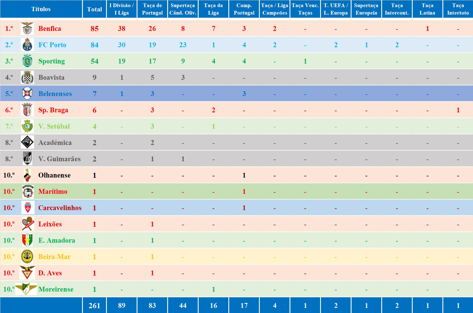 Vencedor Finalista Épocas (Vencedor / Finalista) Benfica 26 12 1939-40; 1942-43; 1943-44; 1948-49; 1950-51; 1951-52; 1952-53; 1954-55; 1956-57; 1958-59; 1961-62; 1963-64; 1968-69; 1969-70; 1971-72; 1979-80; 1980-81; 1982-83; 1984-85; 1985-86; 1986-87; 1992-93; 1995-96; 2003-04; 2013-14; 2016-17 1938-39; 1957-58; 1964-65; 1970-71; 1973-74; 1974-75; 1988-89; 1996-97; 2004-05; 2012-13; 2019-20; 2020-21 FC Porto 19 14 1955-56; 1957-58; 1967-68; 1976-77; 1983-84; 1987-88; 1990-91; 1993-94; 1997-98; 1999-00; 2000-01; 2002-03; 2005-06; 2008-09; 2009-10; 2010-11; 2019-20; 2021-22; 2022-23 1952-53; 1958-59; 1960-61; 1963-64; 1977-78; 1979-80; 1980-81; 1982-83; 1984-85; 1991-92; 2003-04; 2007-08; 2015-16; 2018-19 Sporting 17 12 1940-41; 1944-45; 1945-46; 1947-48; 1953-54; 1962-63; 1970-71; 1972-73; 1973-74; 1977-78; 1981-82; 1994-95; 2001-02; 2006-07; 2007-08; 2014-15; 2018-19 1951-52; 1954-55; 1959-60; 1969-70; 1971-72; 1978-79; 1986-87; 1993-94; 1995-96; 1999-00; 2011-12; 2017-18 Boavista 5 1 1974-75; 1975-76; 1978-79; 1991-92; 1996-97/ 1992-93 V. Setúbal 3 7 1964-65; 1966-67; 2004-05 1942-43; 1953-54; 1961-62; 1965-66 1967-68; 1972-73; 2005-06 Belenenses 3 5 1941-42; 1959-60; 1988-89/ 1939-40 1940-41; 1947-48; 1985-86; 2006-07 Sp. Braga 3 5 1965-66; 2015-16; 2020-21/ 1976-77; 1981-82; 1997-98; 2014-15; 2022-23 Académica 2 3 1938-39; 2011-12 1950-51; 1966-67; 1968-69 V. Guimarães 1 6 2012-13/ 1941-42; 1962-63; 1975-76; 1987-88; 2010-11; 2016-17 Leixões 1 1 1960-61/ 2001-02 Beira-Mar 1 1 1998-99/ 1990-91 E. Amadora 1 - 1989-90 D. Aves 1 - 2017-18 Atlético - 2 1945-46; 1948-49 Marítimo - 2 1994-95; 2000-01 Rio Ave - 2 1983-84; 2013-14 Estoril - 1 1943-44 Olhanense - 1 1944-45 Torreense - 1 1955-56 Covilhã - 1 1956-57 Farense - 1 1989-90 Campomaiorense - 1 1998-99 U. Leiria - 1 2002-03 Paços Ferreira - 1 2008-09 Chaves - 1 2009-10 Tondela - 1 2021-22