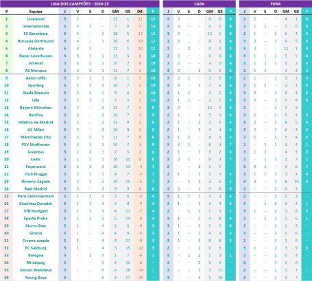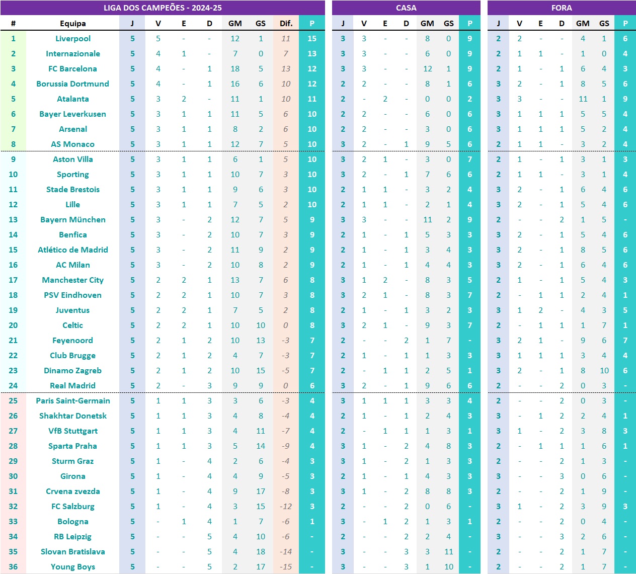 Liga dos Campeões – 2024-25 – 5ª Jornada – Resultados e Classificação