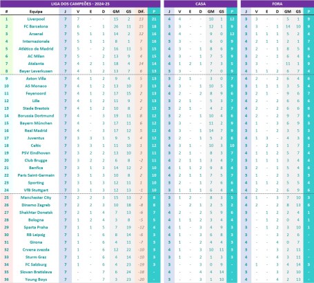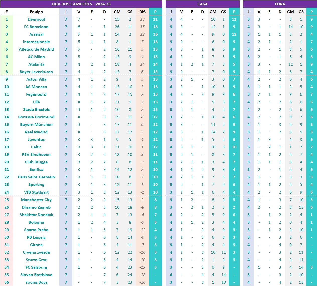 Liga dos Campeões – 2024-25 – 7ª Jornada – Resultados e Classificação