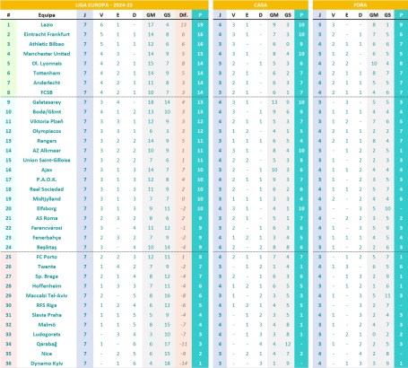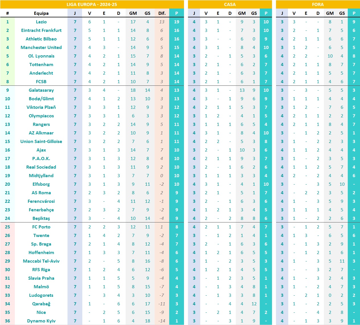 Liga Europa – 2024-25 – 7ª Jornada – Resultados e Classificação
