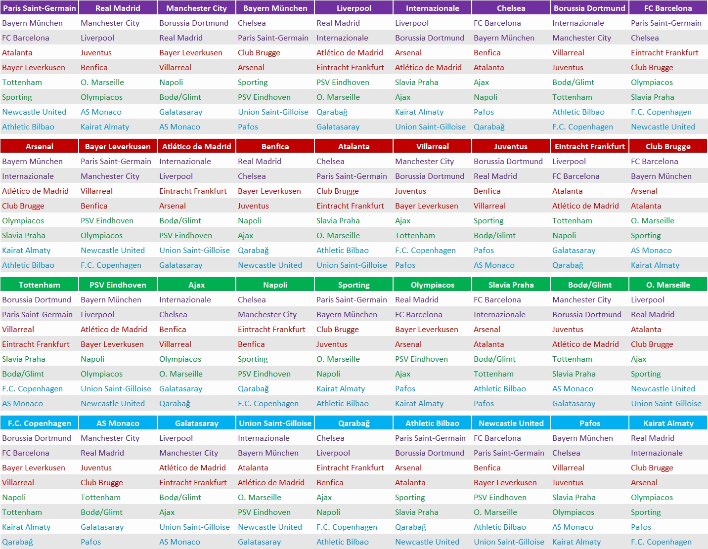 No segundo ano de novo formato, numa “Liga” disputada em oito rondas, com cada clube a defrontar dois adversários de cada um dos “Potes” 1 a 4, é o seguinte o sorteio da “Champions League” 2025-26, indicando-se a sombreado, para cada equipa, os jogos a disputar fora de casa: