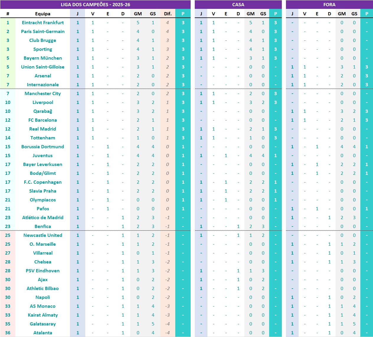 Liga dos Campeões – 2025-26 – 1ª Jornada – Resultados e Classificação