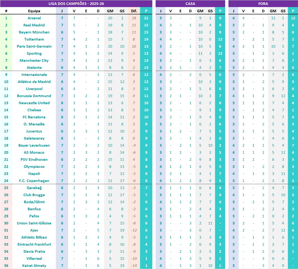 Liga dos Campeões – 2025-26 – 7ª Jornada – Resultados e Classificação