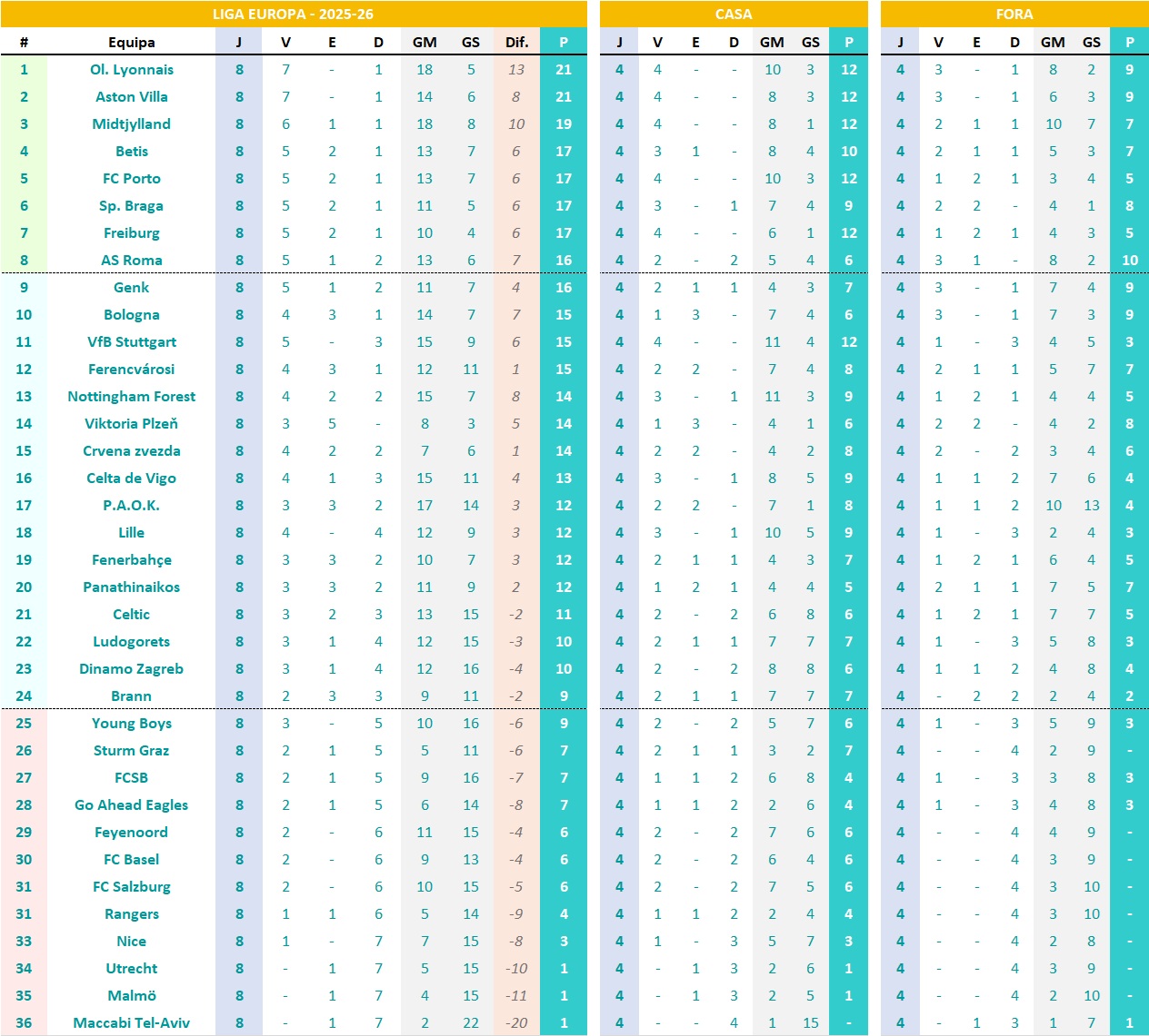 Liga Europa – 2025-26 – 8ª Jornada – Resultados e Classificação