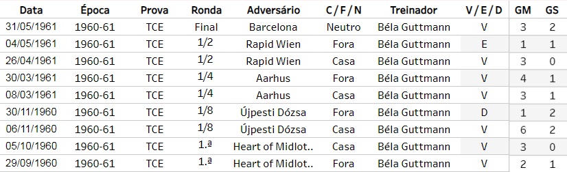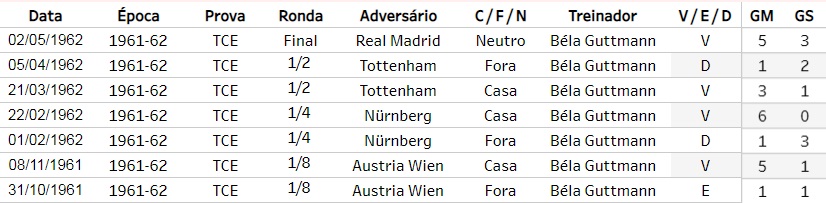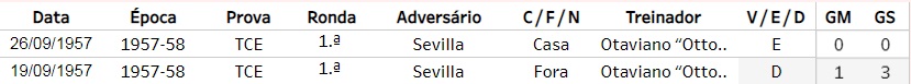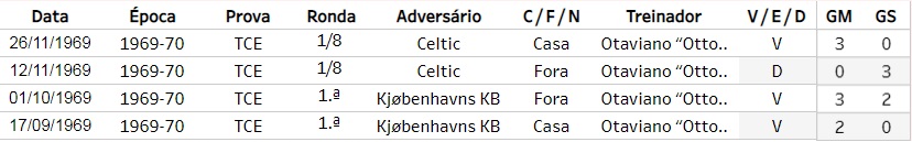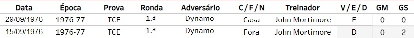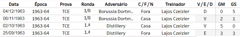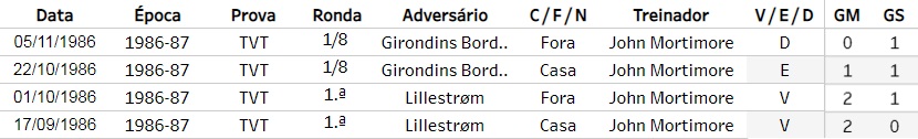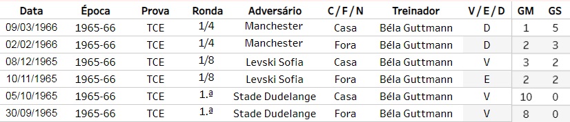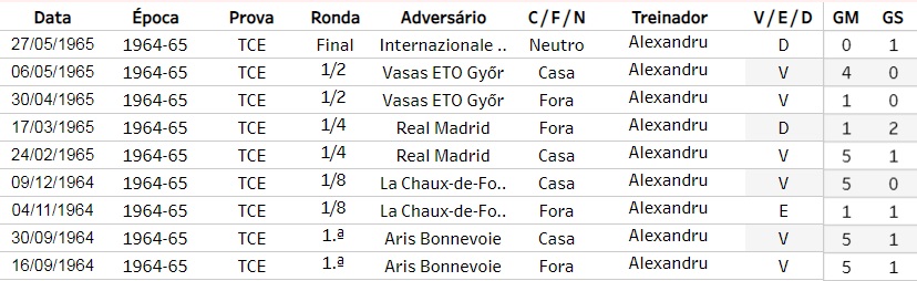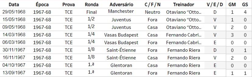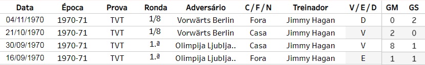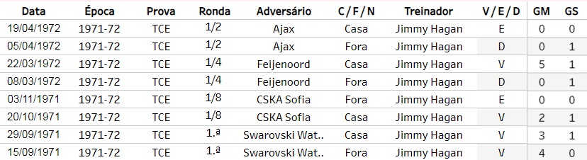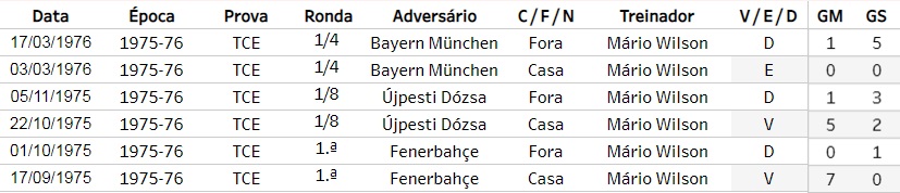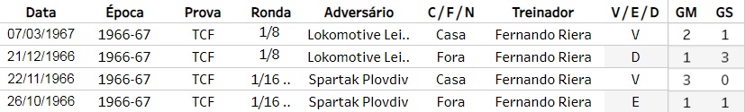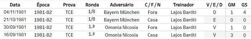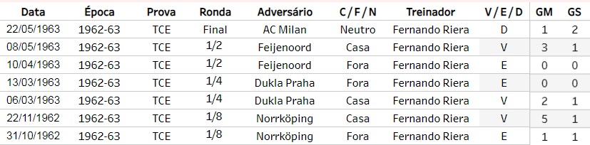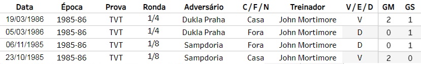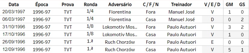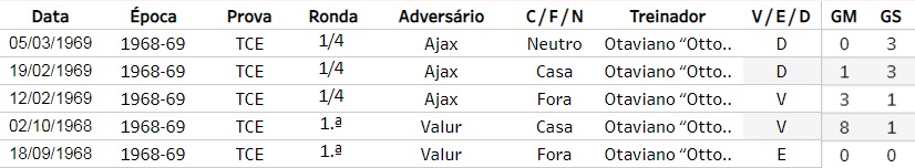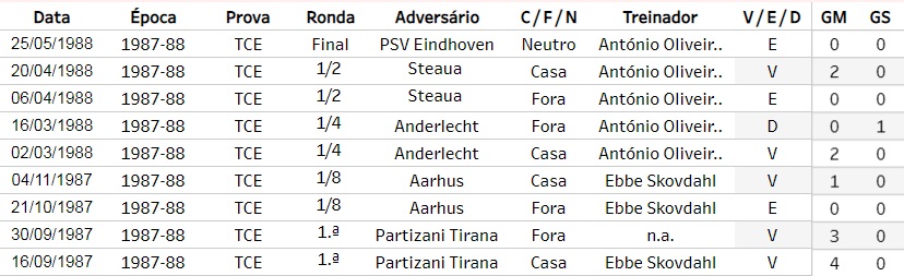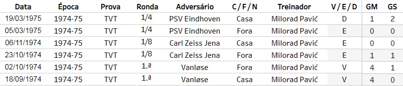 | TVT – Taça dos Vencedores de Taças | 7 | 42 | 21 | 12 | 9 | 67 | 34 | 54 |