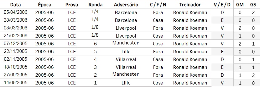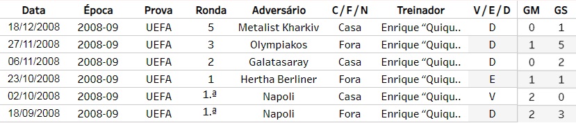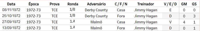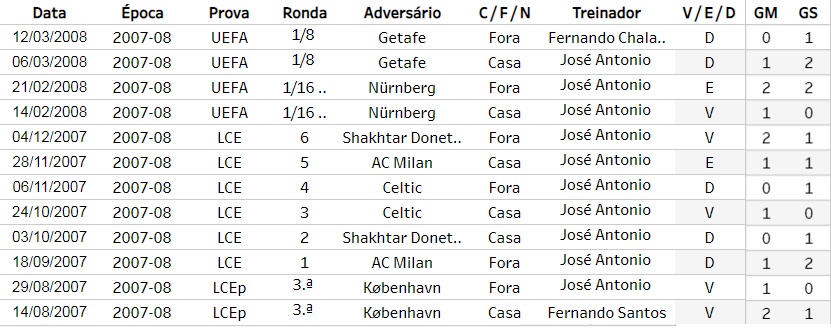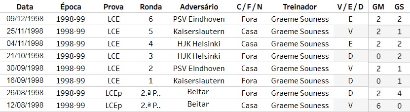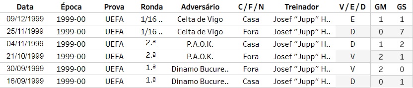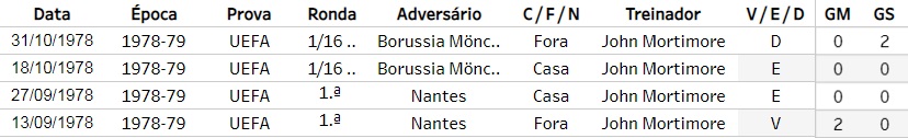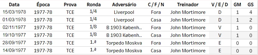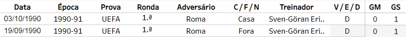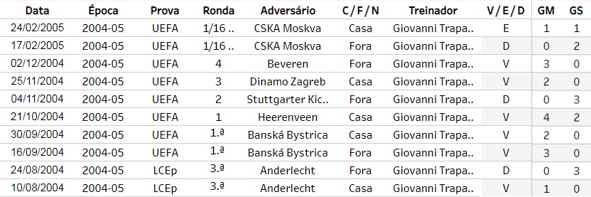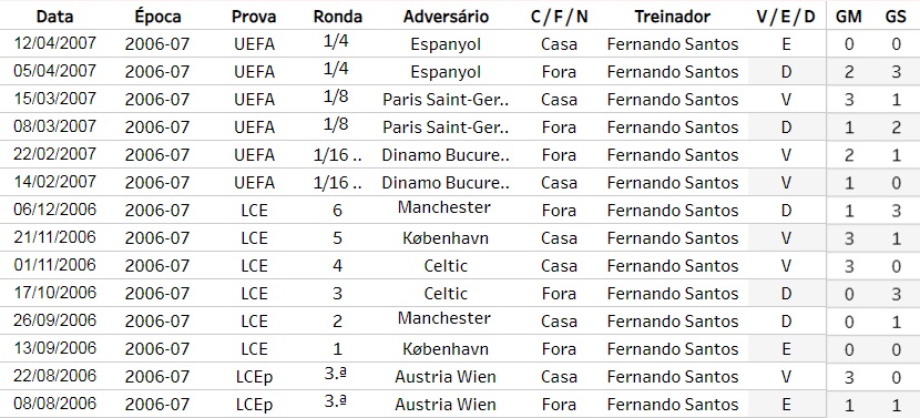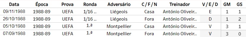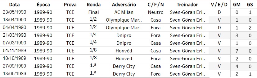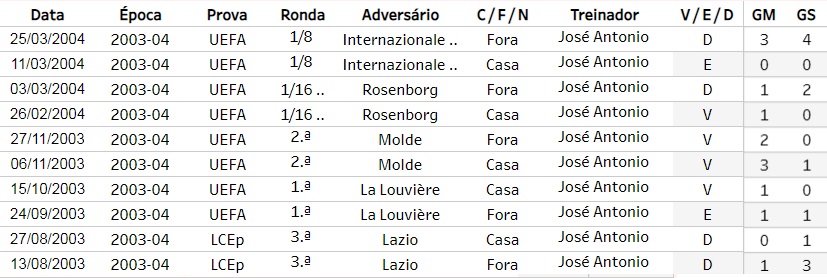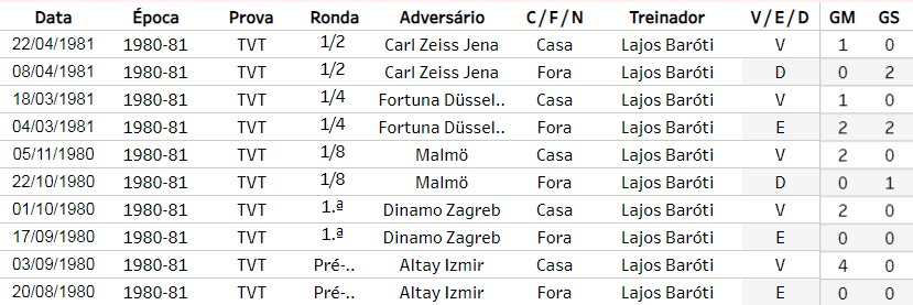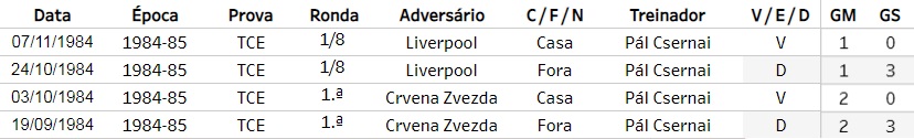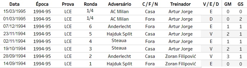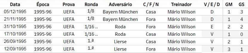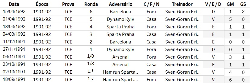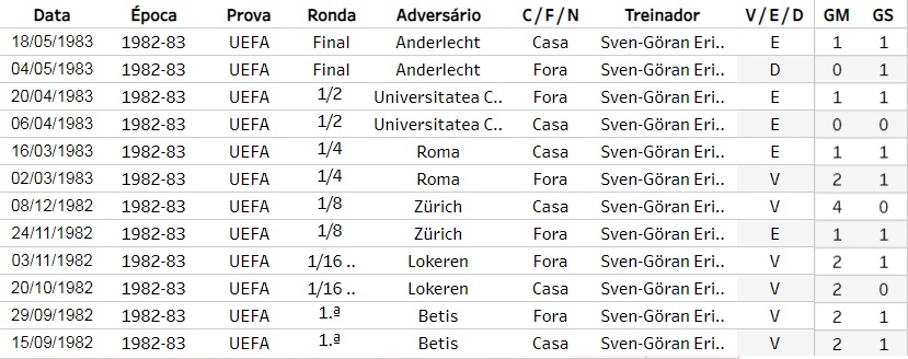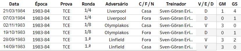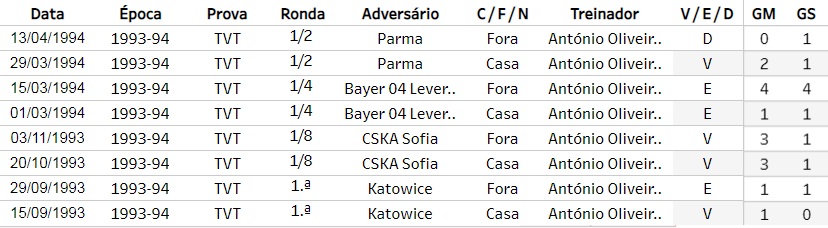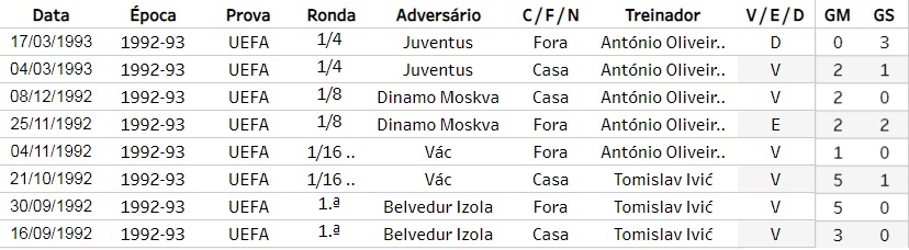 | UEFA – Taça UEFA | 15 | 80 | 35 | 19 | 26 | 116 | 96 | 89 |