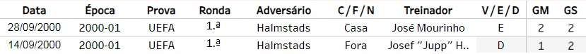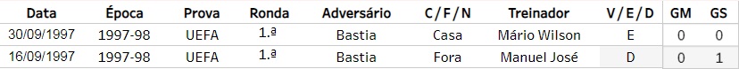 | LEUR – Liga Europa (Pré-Elim.) | 1 | 2 | 1 | – | 1 | 5 | 2 | 2 |