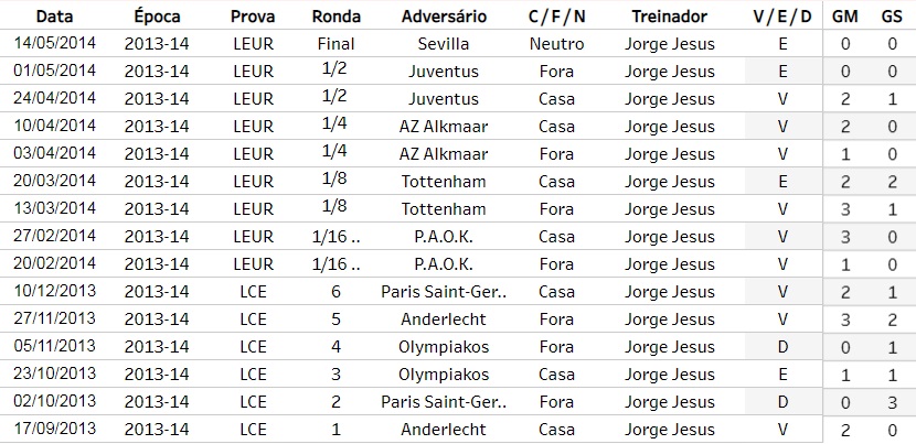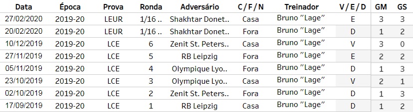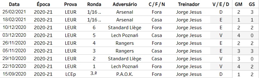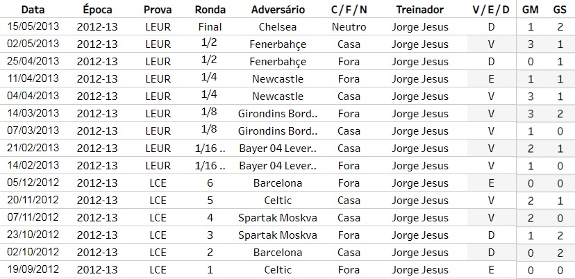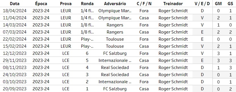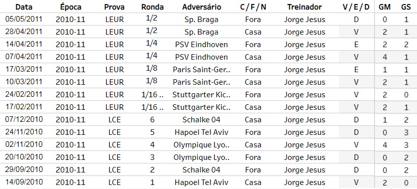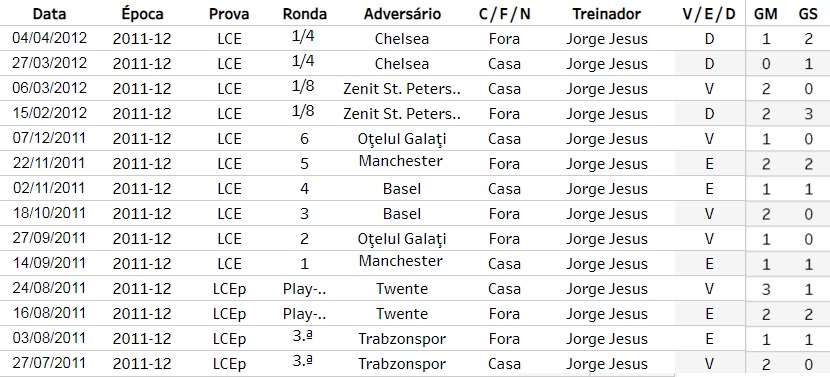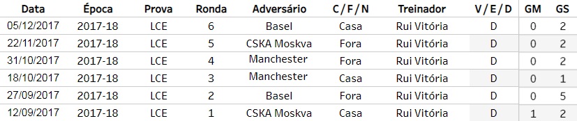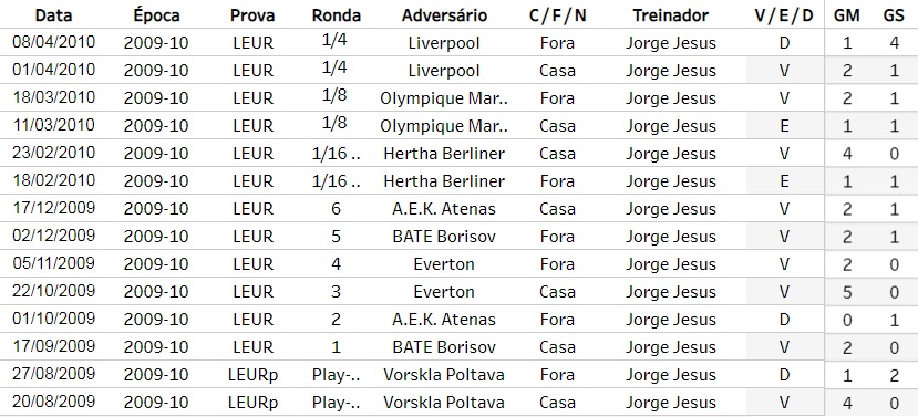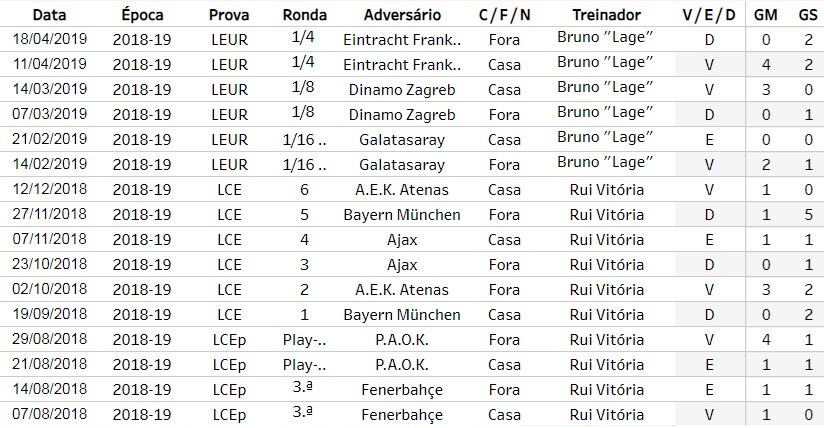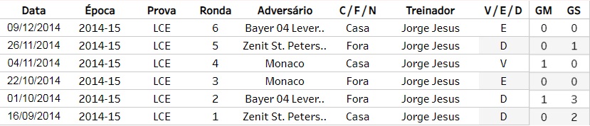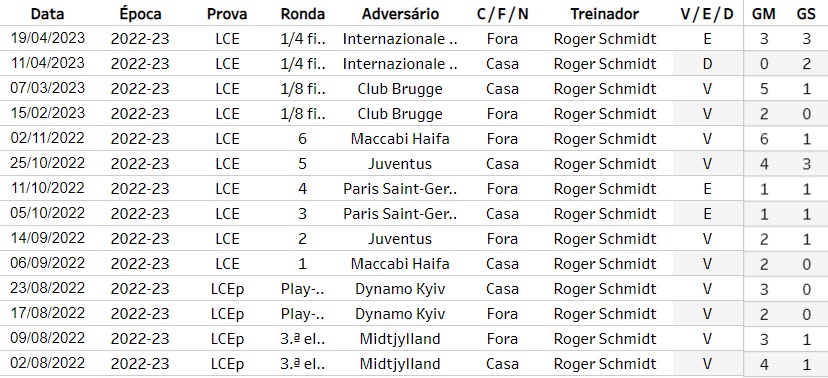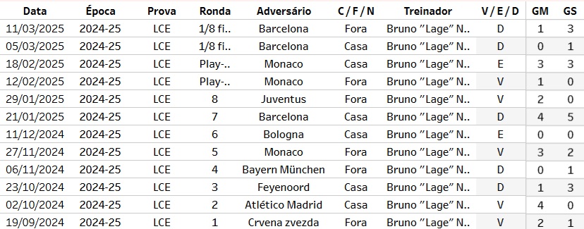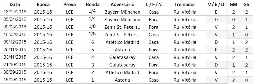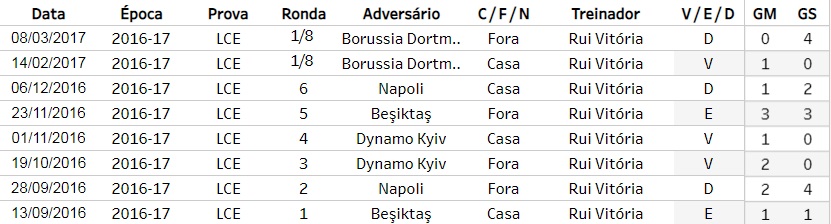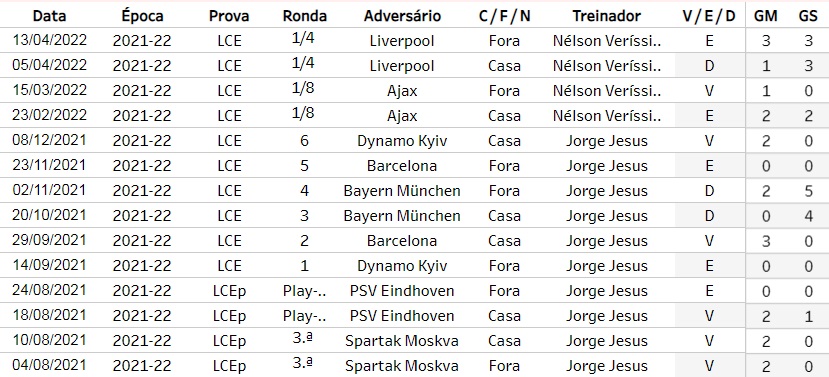 | LCE – Liga dos Campeões | 9 | 4 | 1 | 4 | 9 | 8 |