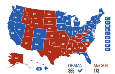 Barack Obama concretiza uma “vitória em toda a linha”, recuperando para o campo Democrata os Estados de Colorado, Florida, Iowa, Nevada, New Mexico, Ohio e Virginia, mais que duplicando o número de “Grandes Eleitores” alcançados por John McCain.