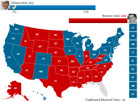 Confirmando a tendência que se foi desenhando e consolidando ao longo da noite, vencendo praticamente todos os “Battle States” (à excepção da North Carolina), Barack Obama garantiu a reeleição como Presidente dos Estados Unidos da América, acabando por confirmar as expectativas que decorriam das sondagens, contando nesta altura (7h50 da manhã) com uma vantagem de 303 – 206 a nível de “Grandes Eleitores” – quando falta apenas definir o vencedor no estado da Florida.