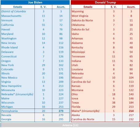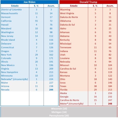 Contando com os Estados em que detém claro favoritismo, e com aqueles em que apresenta, nesta altura, vantagens relevantes, Biden somaria 262 “Grandes Eleitores”, ficando a necessitar apenas mais 8 para garantir a vitória, que poderão provir do Arizona, Wisconsin, Nevada ou, no cenário actual, até da Florida (sendo que, nesse caso, lhe bastaria vencer num destes quatro Estados).
