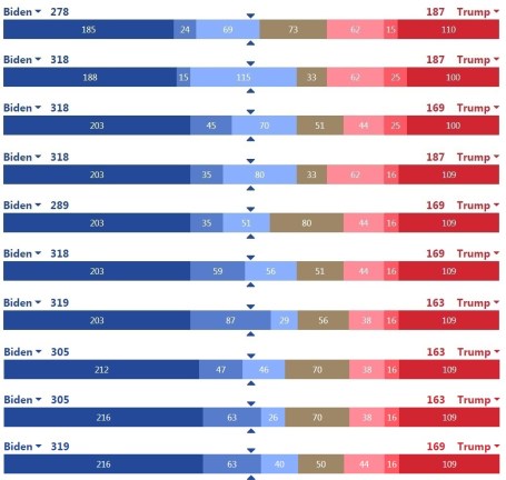 Se tivesse de fazer uma aposta – inevitavelmente falível -, seria nos 290-248, a favor de Joe Biden, com o seguinte detalhe (ordenando os Estados por grau decrescente de probabilidade de vitória de cada um dos candidatos):