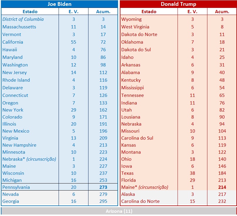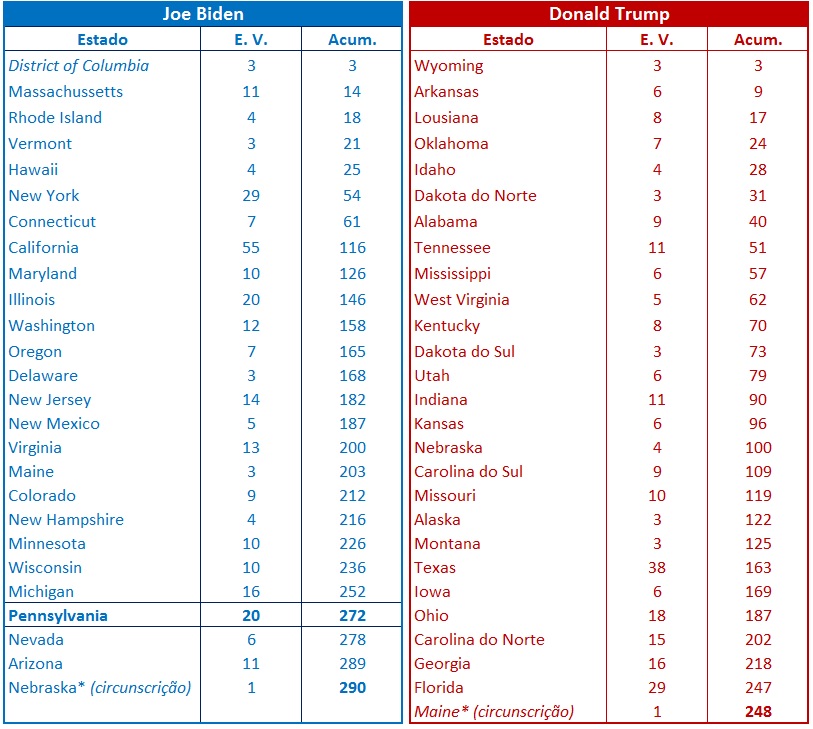 Contando com os Estados em que detém claro favoritismo, e com aqueles em que apresenta, nesta altura, vantagens relevantes, Biden somaria 262 “Grandes Eleitores”, ficando a necessitar apenas mais 8 para garantir a vitória, que poderão provir do Arizona, Wisconsin, Nevada ou, no cenário actual, até da Florida (sendo que, nesse caso, lhe bastaria vencer num destes quatro Estados).
