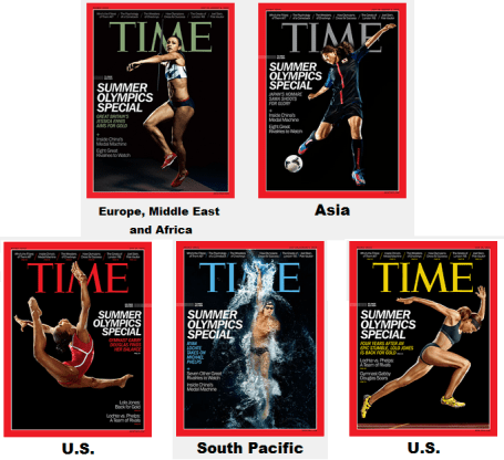 A revista Time da próxima semana apresenta cinco diferentes capas, três nos EUA (com a ginasta Gabrielle Douglas, a barreirista Lolo Jones – a propósito, ver também esta magnífica infografia no The New York Times) e o nadador Ryan Lochte, sendo esta também apresentada na edição da região do Pacífico Sul), outra na edição da Europa / África / Médio Oriente (a atleta britânica de pentatlo Jessica Ennis), e ainda outra para a edição asiática (a futebolista japonesa Homare Sawa).