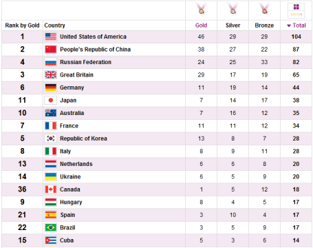 Terminaram os Jogos Olímpicos de 2012, realizados em Londres, culminando a XXX Olimpíada, com o seguinte quadro de medalhas: