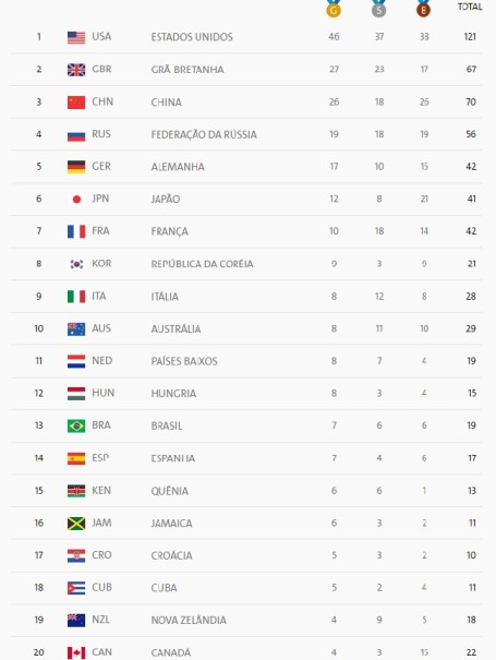 Terminaram os Jogos Olímpicos de 2016, realizados no Brasil, tendo por sede o Rio de Janeiro, culminando a XXXI Olimpíada, com o seguinte quadro de medalhas: