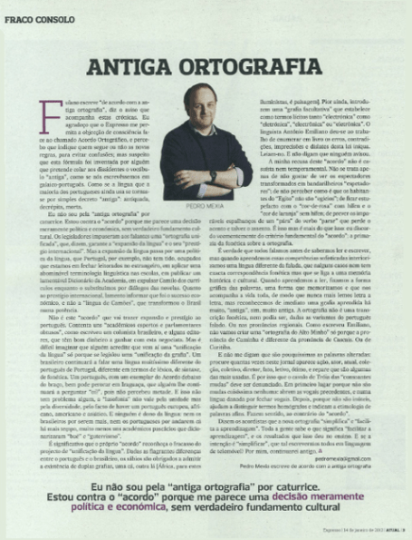 «Fulano escreve “de acordo com a antiga ortografia”, diz o aviso que acompanha estas crónicas. Eu agradeço que o “Expresso” me permita a objecção de consciência face ao chamado Acordo Ortográfico, e percebo que indique quem segue ou não as novas regras, para evitar confusões; mas suspeito que esta fórmula foi inventada por alguém que pretende colar aos dissidentes o vocábulo “antiga”, como se nós escrevêssemos em galaico-português. Como se a língua que a maioria dos portugueses ainda usa se tornasse por simples decreto “antiga”: antiquada, decrépita, morta.Eu não sou pela “antiga ortografia” por caturrice. Estou contra o “acordo” porque me parece uma decisão meramente política e económica, sem verdadeiro fundamento cultural. Os legisladores impuseram aos falantes uma “ortografia unificada”, que, dizem, garante a “expansão da língua” e o seu “prestígio internacional”. Mas a expansão da língua passa por uma política da língua, que Portugal, por exemplo, não tem tido, ocupados que estamos em fechar leitorados no estrangeiro, em aplicar uma abominável terminologia linguística nas escolas, em publicar um lamentável Dicionário da Academia, em expulsar Camilo dos currículos enquanto o substituímos por diálogos das novelas. Quanto ao prestígio internacional, lamento informar que foi o sucesso económico, e não a “língua de Camões”, que transformou o Brasil numa potência.