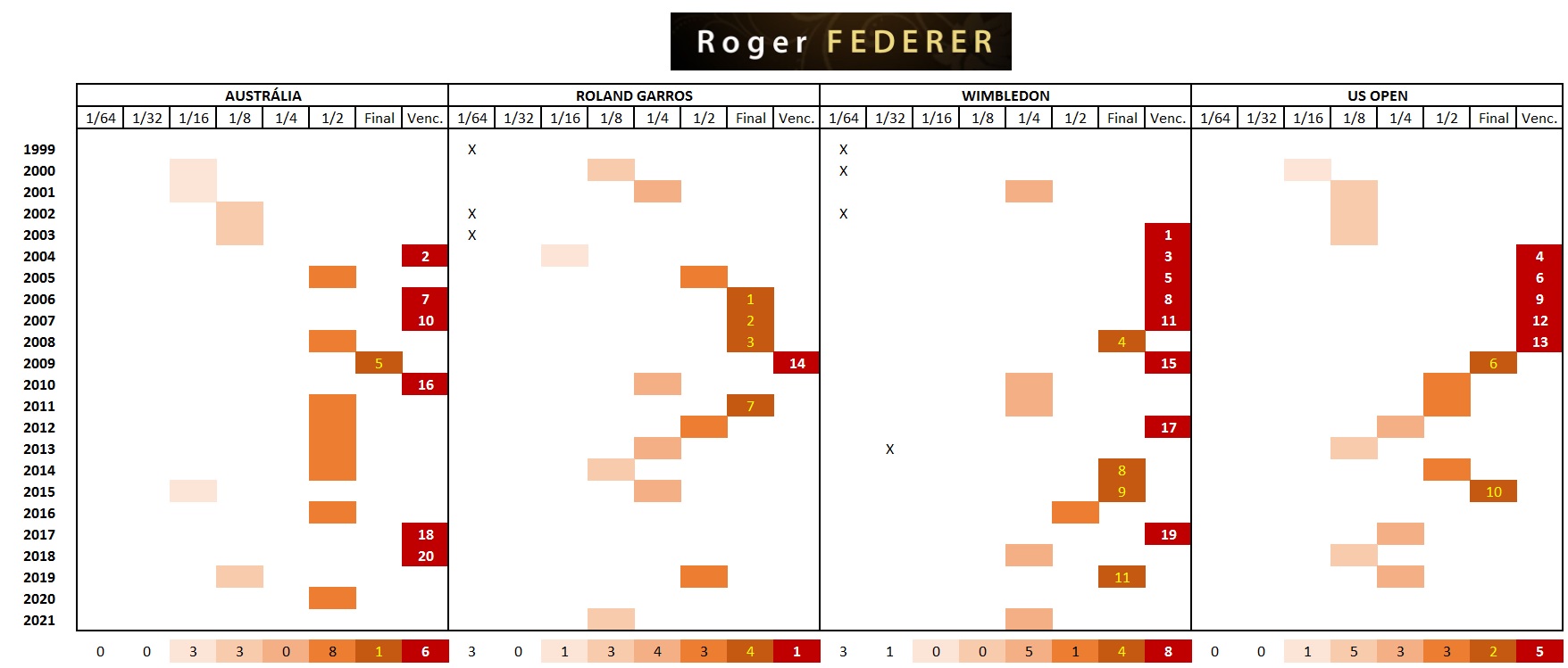 Em termos globais, em 429 encontros realizados nesses torneios, venceu 369 (86%): 105 em Wimbledon, 102 na Austrália, 89 no US open e 73 em Roland Garros. Acrescem ainda outras quatro ocasiões em que seguiu em frente no torneio (2 vezes no US Open, e uma na Austrália e em Wimbledon) por “falta de comparência” do adversário.