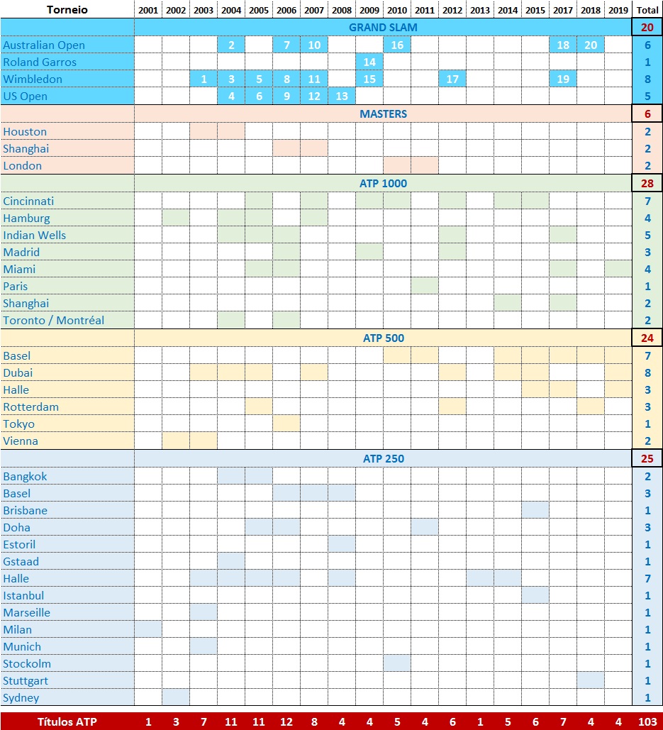 Eis um resumo da sua carreira, expoente máximo do Ténis a nível mundial, com um total de 103 torneios conquistados, entre 2001 e 2019, dos quais 20 “Grand Slam” e 6 “Masters” – tendo liderado o ranking “ATP” por seis ocasiões, ao longo de um total de 310 semanas: