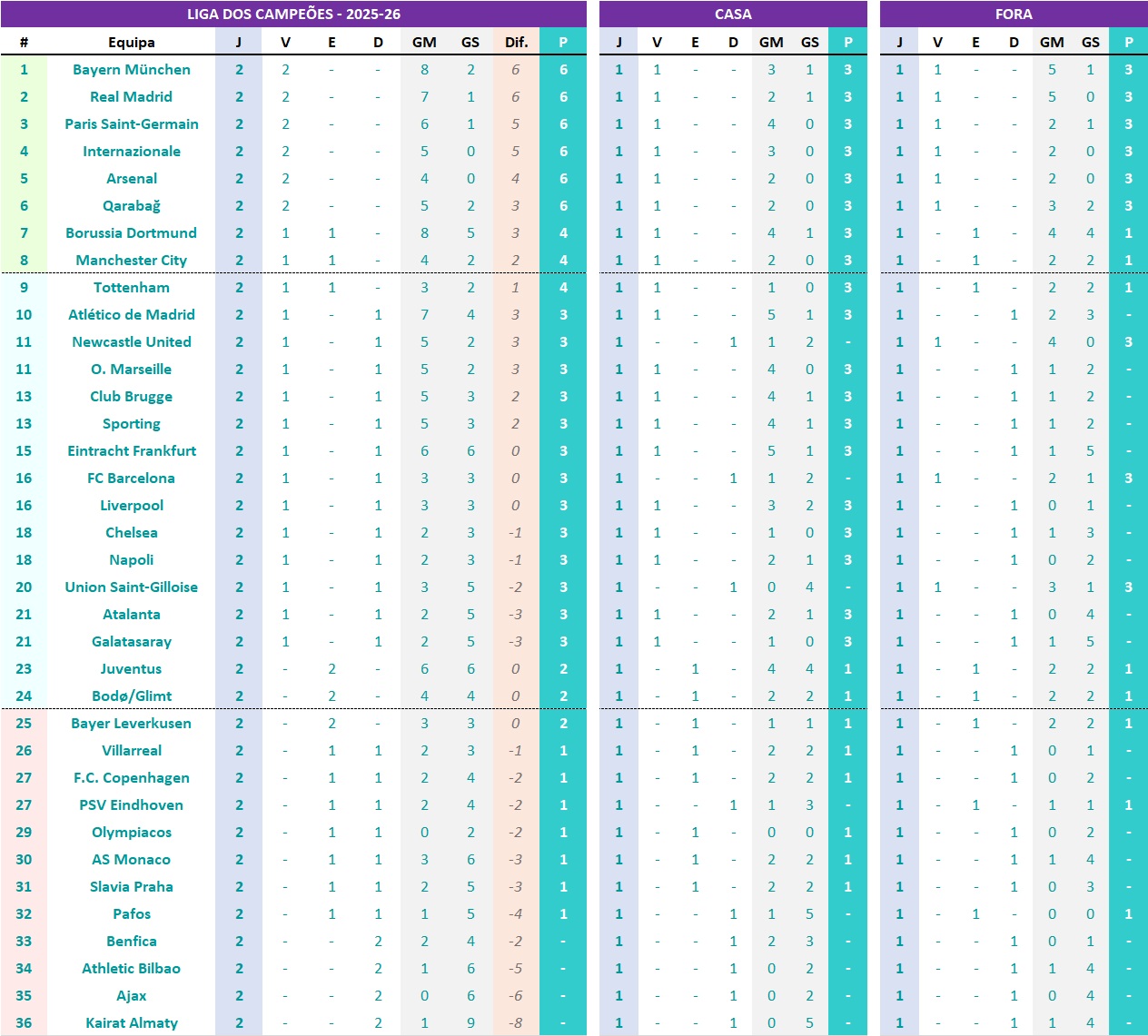 Liga dos Campeões – 2025-26 – 2ª Jornada – Resultados e Classificação