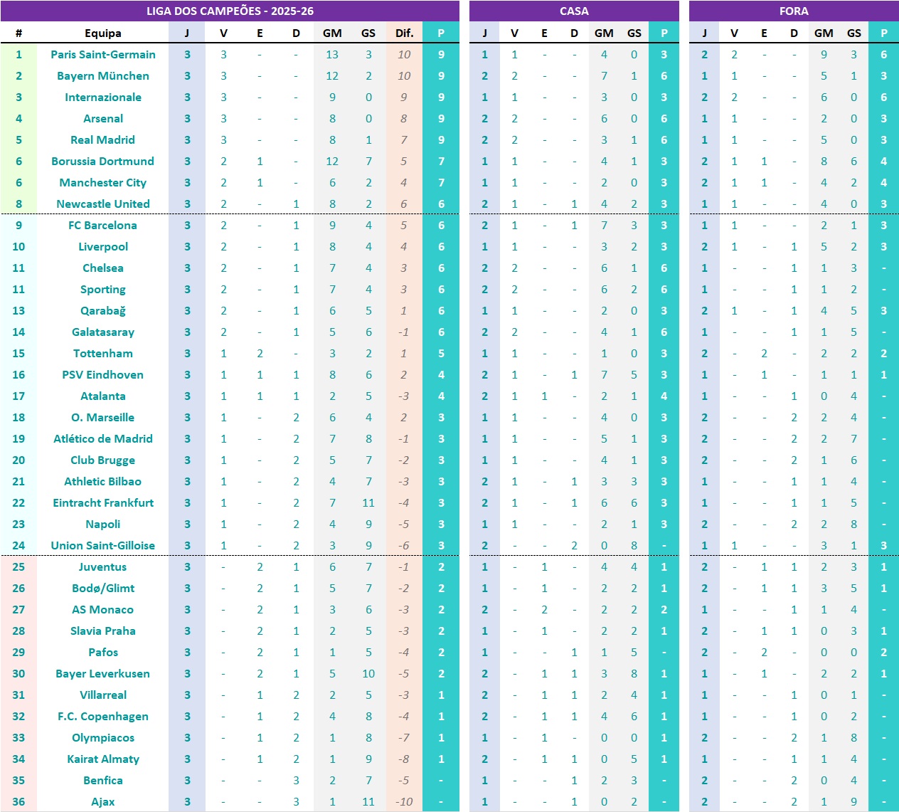 Liga dos Campeões – 2025-26 – 3ª Jornada – Resultados e Classificação