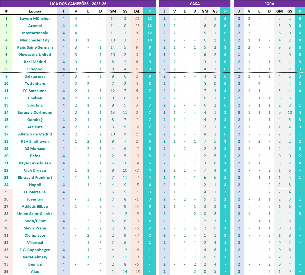 Liga dos Campeões – 2025-26 – 4ª Jornada – Resultados e Classificação