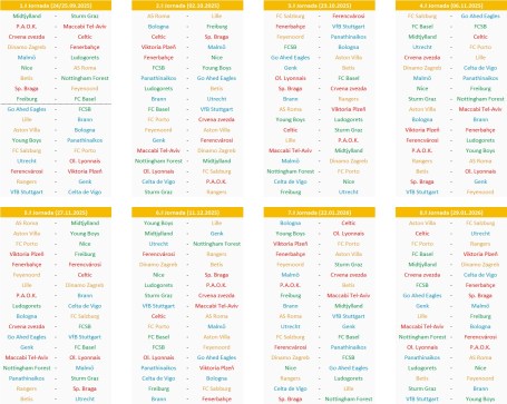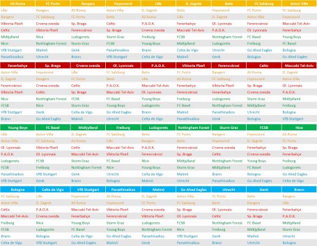 23.10.2025 - FC Salzburg - Ferencvárosi 2-3 23.10.2025 - Fenerbahçe - VfB Stuttgart 1-0 23.10.2025 - Feyenoord - Panathinaikos 3-1 23.10.2025 - FCSB - Bologna 1-2 23.10.2025 - Go Ahead Eagles - Aston Villa 2-1 23.10.2025 - Genk - Betis 0-0 23.10.2025 - Ol. Lyonnais - FC Basel 2-0 23.10.2025 - Sp. Braga - Crvena zvezda 2-0 23.10.2025 - Brann - Rangers 3-0 23.10.2025 - AS Roma - Viktoria Plzeň 1-2 23.10.2025 - Young Boys - Ludogorets 3-2 23.10.2025 - Celtic - Sturm Graz 2-1 23.10.2025 - Lille - P.A.O.K. 3-4 23.10.2025 - Maccabi Tel-Aviv - Midtjylland 0-3 23.10.2025 - Malmö - Dinamo Zagreb 1-1 23.10.2025 - Nottingham Forest - FC Porto 2-0 23.10.2025 - Celta de Vigo - Nice 2-1 23.10.2025 - Freiburg - Utrecht 2-0