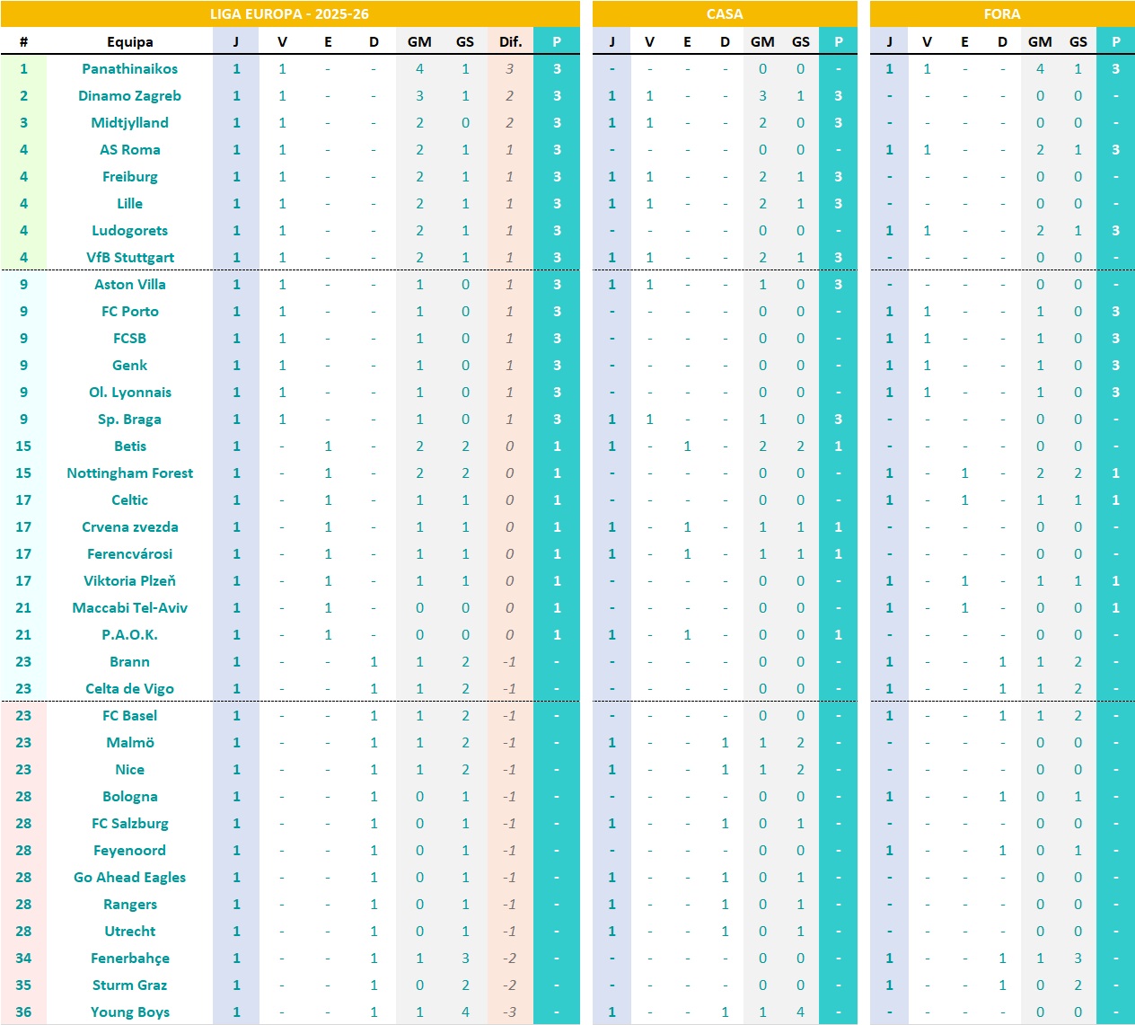 Liga Europa – 2025-26 – 1ª Jornada – Resultados e Classificação