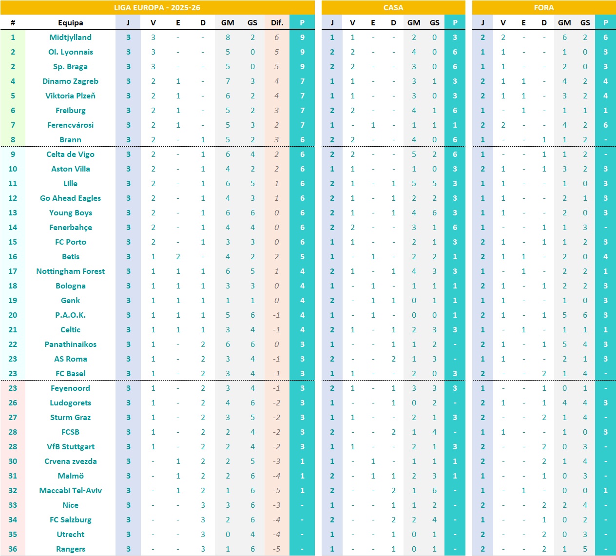 Liga Europa – 2025-26 – 3ª Jornada – Resultados e Classificação